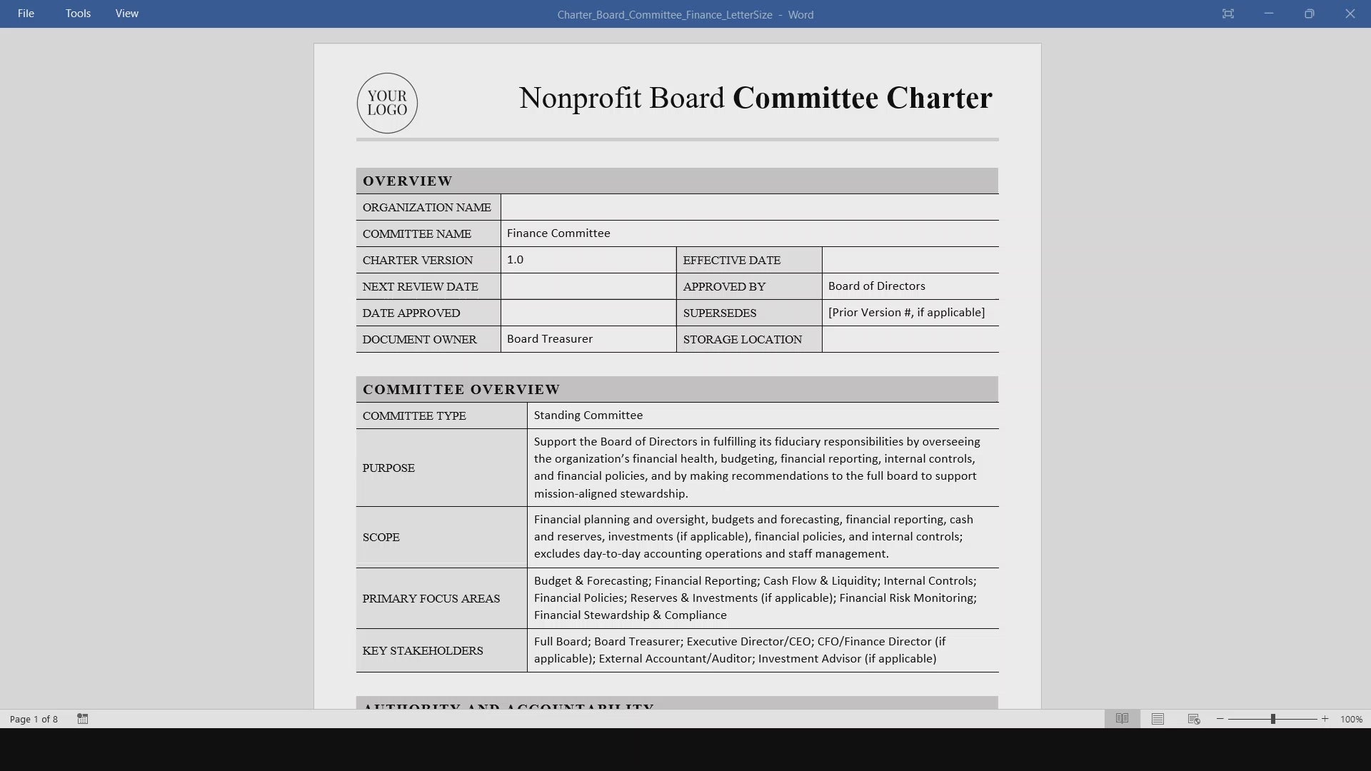 Inside, you’ll find a detailed, structured charter covering committee purpose, scope, authority, responsibilities, and operational procedures. Ideal for nonprofits, foundations, and mission-driven organizations, this template is perfect for boards looking to standardize processes and improve financial oversight.