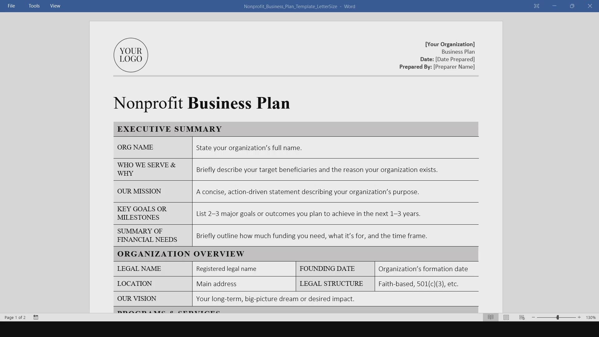 This editable Nonprofit Business Plan template is a professional, printable Word and PDF digital download designed to help nonprofit organizations map out their mission, programs, operations, and funding strategy in one clear document. Created for Microsoft Word, this simple yet comprehensive business plan template gives nonprofits a structured way to present their goals, services, financial needs, and long-term vision.