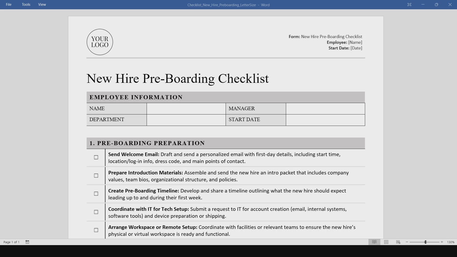 It supports a smoother onboarding experience by helping HR teams, managers, and business owners stay on top of communication, paperwork, IT coordination, workspace setup, and early employee readiness. With clearly grouped checklist items, it reduces missed steps and helps ensure every new hire is set up for a confident, well-prepared start.