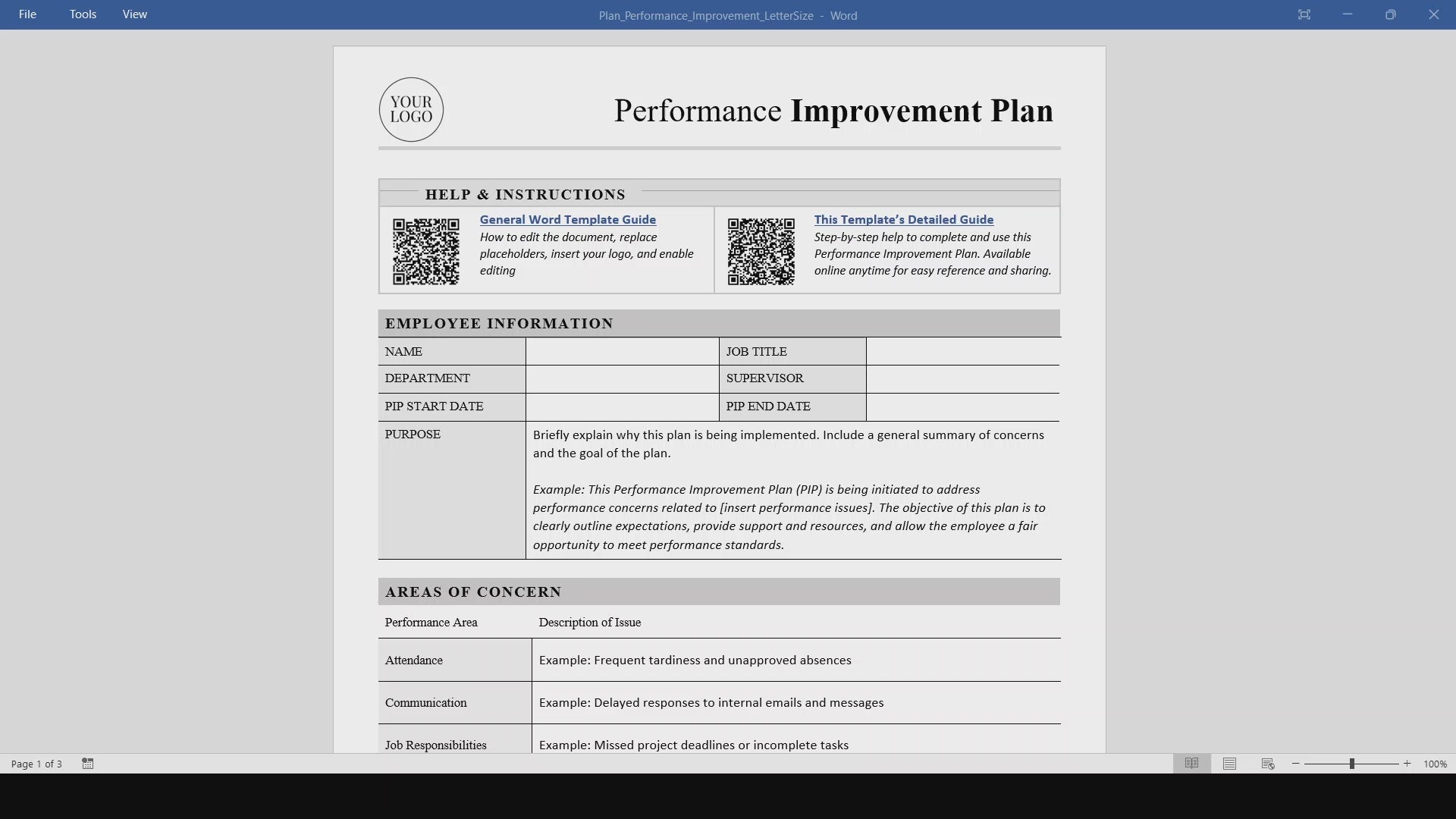 It helps businesses handle employee performance issues more clearly and professionally by outlining areas of concern, expected improvements, support resources, milestones, and acknowledgment steps in one place. This customizable Microsoft Word template can support better documentation, clearer communication, and a more structured path toward performance improvement.