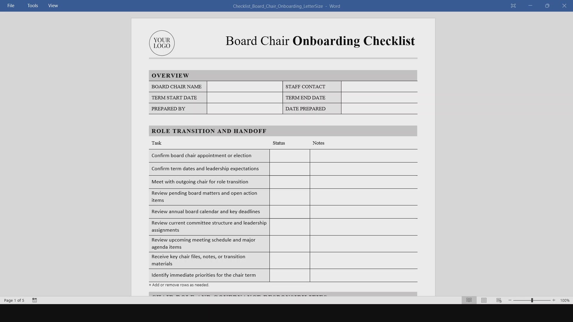 This editable Board Chair Onboarding Checklist template is a professional, printable onboarding and governance checklist designed to help organizations transition new board chairs into leadership smoothly. Created for easy use in MS Word and PDF formats, this customizable digital download gives boards a simple, structured way to manage chair handoff, governance review, and early leadership responsibilities.