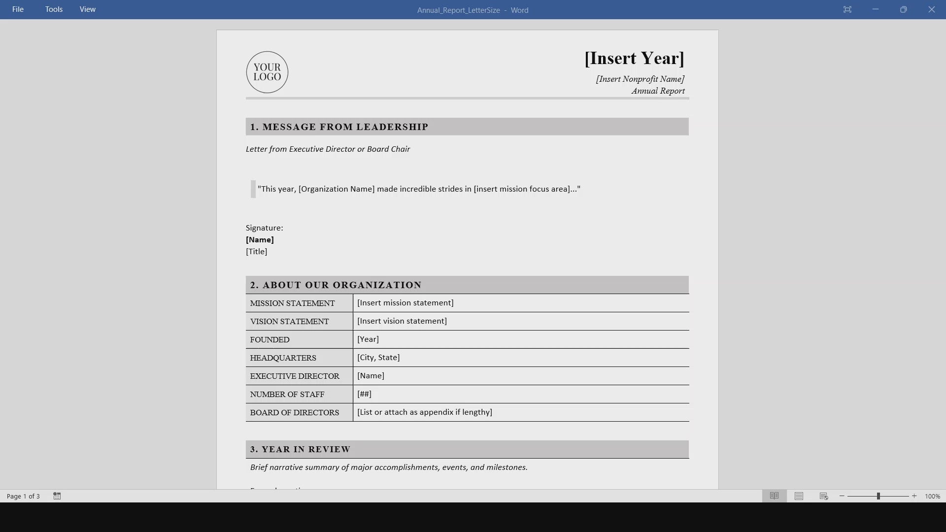 Create a polished and professional nonprofit annual report with this editable Nonprofit Annual Report Template, designed in Microsoft Word and delivered as a printable PDF. This simple, customizable template provides a clean, structured format to showcase your organization’s impact, financials, and key achievements in a clear and compelling way.