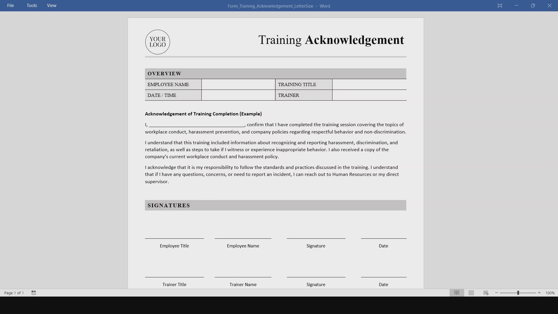 This Training Acknowledgement template is an editable, printable Microsoft Word / MS Word template with a PDF version, designed to document employee training completion in a clear and professional format. It helps businesses confirm that staff members have completed workplace conduct, harassment prevention, and company policy training while maintaining a consistent HR documentation process.